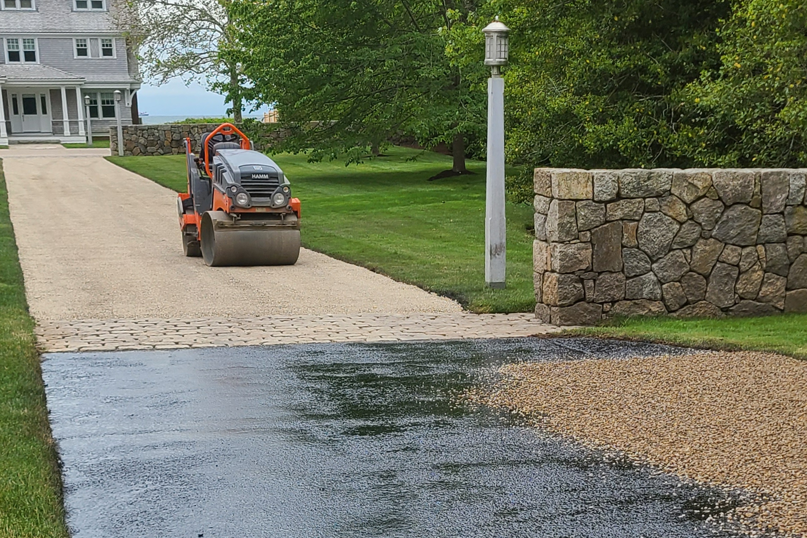The installation of a stone-seal driveway is made up of a sub-base and one course of hot mix asphalt. The asphalt is topped with a layer of hot oil emulsion and stone. The bottom layer of the stone clings to the hot oil emulsion but the top layer of stone stays loose to give the look of a natural stone driveway.